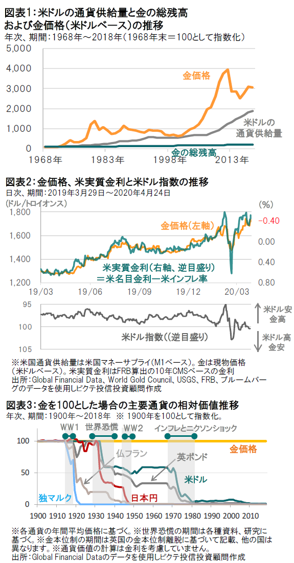 金は長期的には通貨との供給量差異と連動、短期的には実質金利や米ドル指数と逆相関