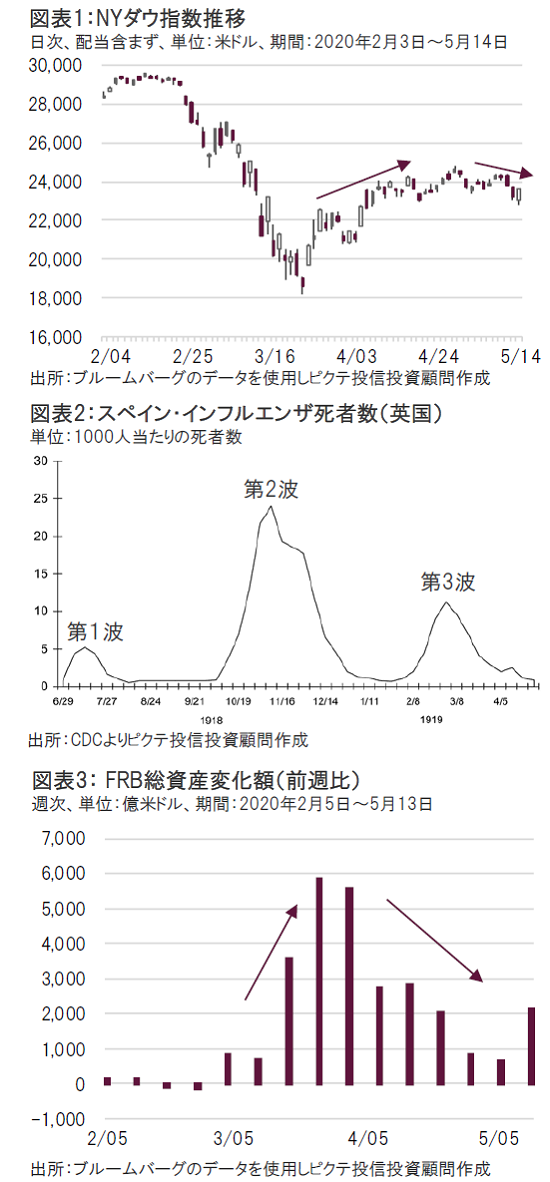 1つ目の要因は米国立アレルギー感染症研究所のファウチ所長の発言だ。米国で複数の州が経済活動再開に向けて動く中、12日の米上院公聴会でファウチ所長は、都市封鎖の解除を急げば感染がさらに拡大し、経済回復を妨げる可能性があると議会に警告した。1918年から1919年にかけて大流行し、世界で約4000万人の死者が出たと言われるスペイン・インフルエンザでは、感染流行の第1波よりも第2波のほうが死者数が増加した事例があるため、新型コロナ対策チームの主要メンバーであるファウチ所長の発言は、マーケットに緊張感をもたらした可能性がある。2つ目の要因は米中対立だ。大統領選挙を今年11月に控えるトランプ大統領は、新型コロナの感染拡大を巡り中国への非難を繰り返している。米国上場の中国企業に対する監視強化が検討されているほか、連邦職員向けの確定拠出年金を運営する連邦退職貯蓄投資理事会(FRTIB)が中国株への投資を延期すると13日に発表するなど、中国に対する圧力を強めている。米中対立が貿易やIT覇権争いにとどまらず、金融市場へ波及することをマーケットは警戒している。3つ目の要因は、パウエル米連邦準備制度理事会(FRB)議長が13日に行った講演だ。パウエルFRB議長は景気の先行きについて極めて不確実だとし、第2次世界大戦以降のどの不況よりもはるかに悪いと表現した。また、景気回復が勢いづくまで時間がかかる可能性があり、時間が経過すれば流動性の問題が支払い能力の問題に変わりかねないと警告した。
