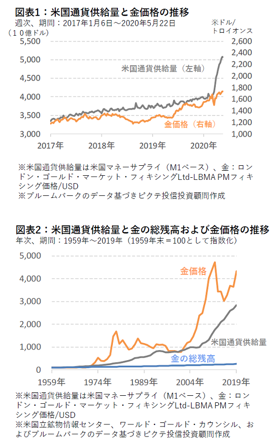 2020年3月23日米連邦準備制度理事会(FRB)は無制限の量的緩和を決定した。その後急速に拡大してきている指標がいくつかあるが、その一つが米国通貨供給量だ(図表1参照)。米国通貨供給量は3月20日の週の4兆1365億ドルから、わずか9週間で+9,297億ドルと約23%増加し、5月22日の週には5兆662億ドルとなった。金の供給量は限定的であるのに対し、このような米国通貨供給量の拡大は、ドルの通貨価値の下落と、供給量が限定的な金の価格上昇を引き起こす可能性がある。