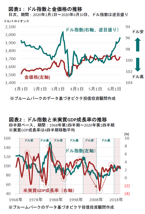 今回のFOMCでは2020年の米実質GDP成長率見通しはー6.5%(前年比)と下方修正されたが、それは足元のドル安と整合的だ。もし、これから数年にわたりゼロ金利政策が継続するだけにとどまらず、長期的なドル安の中にすでにいるのだとすれば、それはドルの価値の減価とともに金への投資需要の拡大の要因となると考えられる。