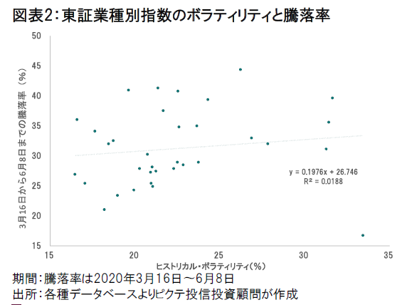 同様のことがボラティリティにも言える。株価の急速な上昇局面では、高いボラティリティの業種・銘柄が先導する例が多く見られ、同じくグラフ上の横軸にボラティリティ、縦軸に騰落率を置くと、一次回帰直線は右肩上がりになる傾向がある。しかし、今回のケースでは、一次回帰直線には傾きがなく、R2は0.02と完全無相関を示す状況だ(図表2)。つまり、高いボラティリティのリスクを採っても、必ずしも好いリターンを得ることができていないわけだ。