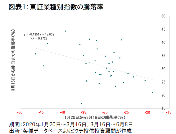 現在までのところ、2020年におけるTOPIXの高値日は1月20日、安値日は3月16日である。その後のリバウンドで、6月8日までにTOPIXは31.9%上昇し、下げ幅の77.7%を回復した。下落時も、戻り局面も、そのスピードの速さは歴史に残るものだろう。下げ相場の要因が現代人の多くが経験したことのない世界に広がる感染症であり、反発も過去に例のない規模での財政・金融政策が背景のため、どうやら従来の常識はあまり役に立たないらしい。