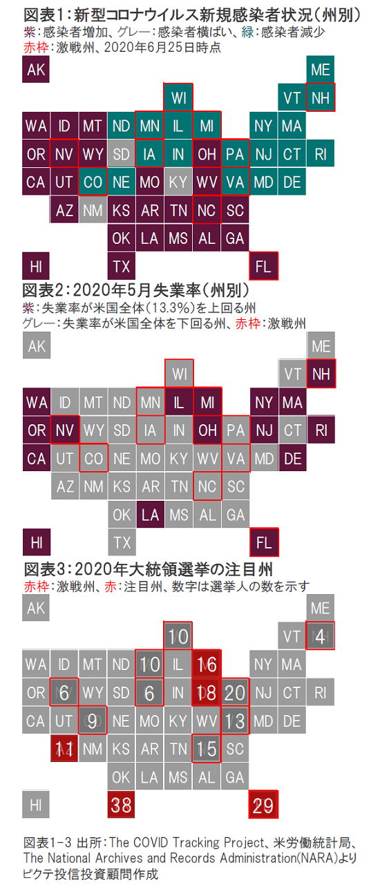 米国では南部や西部の州を中心に、新型コロナウイルスの新規感染者数が増加傾向にある。特にテキサス州、アリゾナ州、フロリダ州では顕著に感染が拡大しており、「第2波」のリスクが高まっている。米国は今年11月3日に大統領選挙を控えているため、「激戦州」における新型コロナウイルス感染と失業率の状況は大統領選挙の結果を大きく左右しかねない。