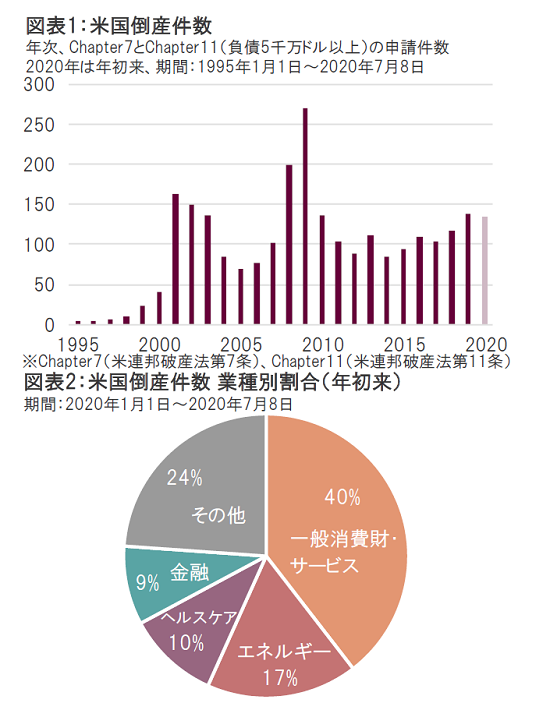 米国の倒産件数(負債5千万ドル以上)は7月8日時点で年初来134件、すでに2019年通年の139件に迫る勢いだ(図表1)。倒産件数を業種別で見ると、小売が含まれる一般消費財・サービスが全体の40%、エネルギーが17%であり、2業種を合わせると過半を占める(図表2)。この2業種が多大なる影響を受けていることは自明の理だが、逆に言えばそれ以外の業種が全体の43%を占めていることを意味し、決して「企業淘汰」の波が特定業種にのみ押し寄せているわけではないことが分かる。