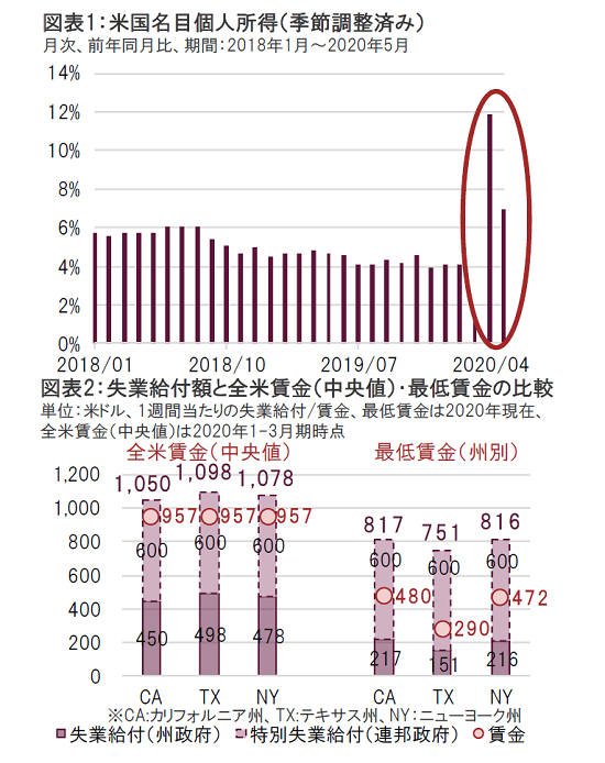 米国では新型コロナウイルスの感染拡大に伴う対策として、総額2.2兆ドルに及ぶコロナウイルス支援・救済・経済安全保障法(CARES法)がトランプ大統領の署名によって3月27日に成立した。この法律によって、連邦政府による個人への支援金や1週間で一律600ドルの失業給付の増額が支給されることになった。このため、4月の米国個人所得は前年同月比で11.9%増となり、戦後最悪とされる景気後退の最中、逆に個人所得の増加率が加速するという極めて希な現象が起こった(図表1)。