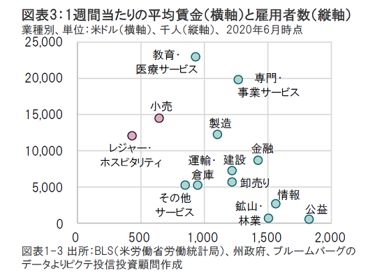 しかし、逆に言えば特別失業給付が失効した場合の影響が大きくなるのが、失業前の賃金が低かった失業者になる。賃金水準を業種別にみると、小売やレジャー・ホスピタリティが相対的に低くなっており、これらの業種はロックダウン(都市封鎖)によって失業者を大量に抱えた業種でもある(図表3)。このまま失業給付の増額が7月末で失効した場合、多くの失業者の個人所得が急減することになりかねない。連邦上院は休会明けの来週20日から失業給付増額の延長など、追加の景気刺激策について議論を再開させる予定だが、民主党と共和党との間で意見の隔たりは依然として大きく、残された時間も限られている。この先、数週間が正念場だろう。