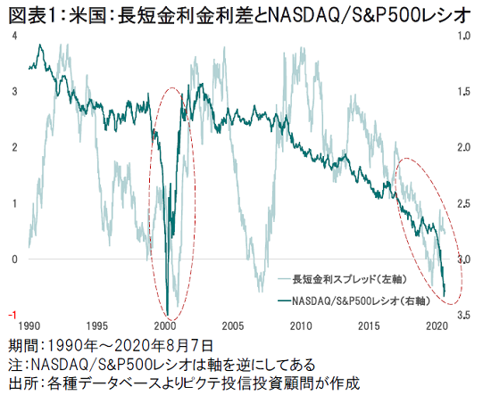 新型コロナ禍の下、世界的にIT・デジタル関連のアウトパフォームが続いている。米国では、NASDAQ/S&P500レシオがITバブル期に迫った。流動性の大量供給だけでなく、名目金利がゼロになったことで、バリュエーションの割高感に対する感応度が落ちたことも背景だろう。この相場の転換点は、長期金利の上昇によるイールドカーブの変化、即ち景況感の改善なのではないか。