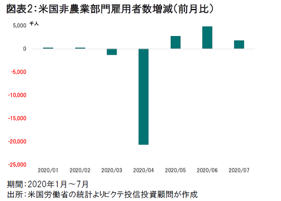 8月7日に発表された米国7月の雇用統計は、若干のポジティブサプライズとなった。ただし、新型コロナ禍により3、4月に非農業部門雇用者数が2,206万人減少したのに対し、5月以降の3ヶ月における増加数は927万9千人に留まっている(図表2)。経済活動再開を急いだ結果、テキサス、フロリダ、カリフォルニアなどで新型コロナの感染者が急増したことから、官民ともにより慎重な再開対応を迫られるだろう。結果として、雇用の回復は緩やかなペースになるのではないか。