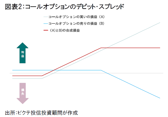 もっとも、一部の報道により、別の株価上昇要因が浮かび上がっている。9月4日付けのウォールストリートジャーナルは、SBGが、8月以降、アマゾン、ネットフリックス、マイクロソフトなど合計で40億ドル近くの現物株を購入したことに加え、関係者の話として、それらの銘柄のコールオプション(CO)を買ったこと、さらに行使価格の高いCOを売ったことを報じた。このCOの売り買いの組み合わせは、デビット・スプレッドと言われる複雑な取引手法だ(図表2)。
