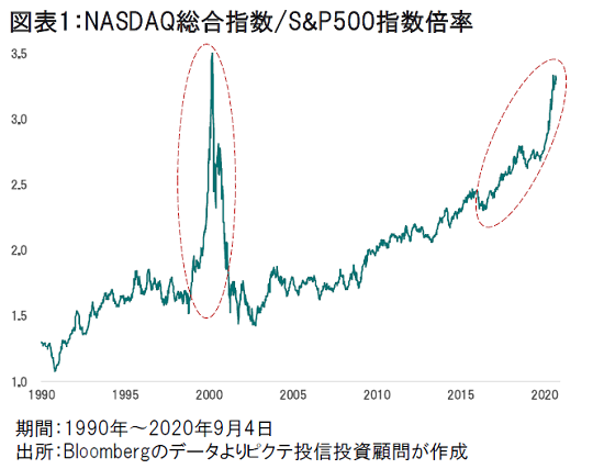NASDAQ総合指数が最高値を記録した9月2日、S&P500で割った倍率は3.37倍となり、ITバブルのピークであった2000年3月3日の3.49倍に接近した(図表1)。新型コロナ禍による社会のリモート化への観測から、関連するIT系銘柄などが集中的に物色された結果だろう。また、FRBによるゼロ金利政策と量的緩和の組み合わせは、伝統的なバリュエーション評価に基づく警戒感を大きく緩和したようだ。