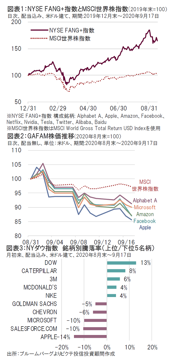 MSCI世界株指数は月初来で軟調に推移している。これまでコロナ禍で競合上優位とされてきた超大型株のGAFAM銘柄の上昇が、9月に入ってから一転して下落基調となったことがその要因として挙げられる。GAFAM銘柄はコール・オプションなどを投機的に活用してきた個人投資家や機関投資家が物色していた銘柄だっただけに、今月に入って「ポジション調整(買われ過ぎの反動)」が起こった可能性がある。