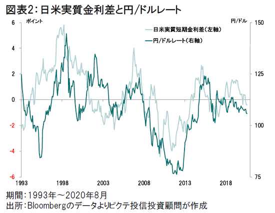 円/ドルレートは、日米の実質金利差に大きな影響を受けてきた(図表2)。世界的な景気後退期においては、日本の実質金利が米国を上回るため、円に資金が流れてドル安/円高になり易い。さらに、円高になれば、日本の物価には一段の下落圧力が掛かり、デフレスパイラルの状況が起こり得る。実質金利が一段と上昇し、円高が加速するからだ。このループを抜けられなかったのが、リーマンショックから2012年秋までの約4年間だった。