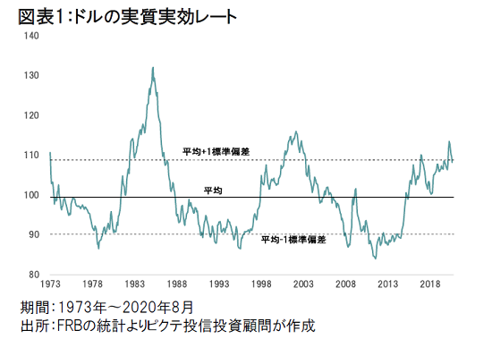 1973年の変動相場制移行後のドルの実質実効レートは、インフレ抑止のため高金利政策を採っていた1980年代前半に大きく上振れしたが、長期的には100を中心に概ねプラス・マイナス10の範囲で振幅を繰り返してきた(図表1)。直近の循環では、米国経済がリーマンショックを抜け切った2011年7月の83.89を底に上昇に転じ、今年5月に113.39で天井を付けている。もっとも、引き続きドル高ゾーンと言える状況であり、新型コロナ・ショックで景気が失速したことを考えた場合、デフレ圧力を緩和するため米国政府・FRBがドル安を好ましく考えても不思議ではないだろう。