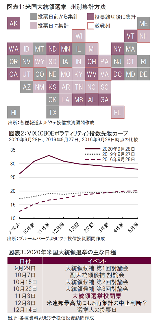 米国大統領選挙まで残りわずかとなる中、VIX先物カーブは大統領選挙にかけてボラティリティ(変動性)が上昇することを織り込んでいる。このようなVIX先物カーブの形状は、4年前の大統領選挙時には見られなかった現象であり、市場関係者は今回の大統領選挙を重大なリスクイベントとして認識していることがうかがえる。