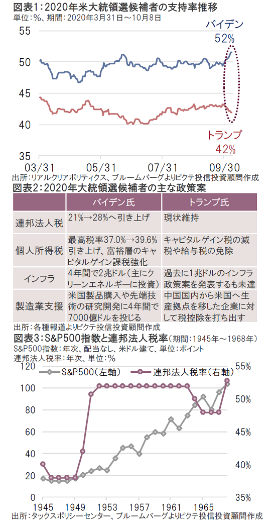 米大統領選における第1回目のTV討論会とトランプ米大統領による新型コロナ感染を受けて、マーケットではバイデン氏が大統領選に勝利する見方が強まっているだけでなく、民主党が上院と下院で過半を占める「ブルーウェーブ(青い波)」シナリオも織り込まれつつある。バイデン氏が公約として掲げる増税は、株式市場にとって杞憂に終わるのだろうか?