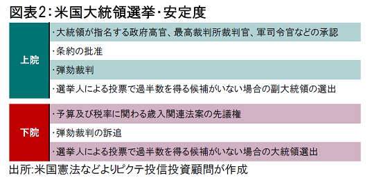 バイデン氏が次期大統領に就任するにせよ、トランプ大統領が続投するにせよ、連邦議会上院は共和党が、下院は民主党が過半数を維持する可能性が強まった。米国の場合、上院と下院の権限は基本的に同一だが、いくつかの点で役割分担に相違がある(図表2)。例えば、政府高官の政治任用は、大統領が指名し、上院が承認しなければならない。バイデン大統領のケースでは、少なくとも共和党上院議員の数名から支持を取り付ける必要があり、政権運営は当初から窮屈なものとなることが予想される。