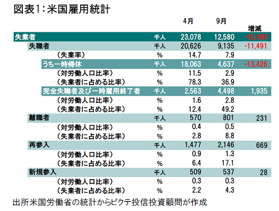 6日に発表される10月の米国雇用統計では、失業率が前月の7.9%から6%台に低下するシナリオもあり得る。ただし、注目すべきはその中身ではないか。9月の統計を見ると、最悪の状態だった4月と比べ、失業者は1,149万人減少した(図表1)。このうち、一時帰休者の職場復帰が1,343万人に達する一方、完全失業者は194万人増加している。新型コロナ禍による社会・経済の変化により、企業や事業者の破綻、業務の見直し、縮小が続いている結果と言えよう。