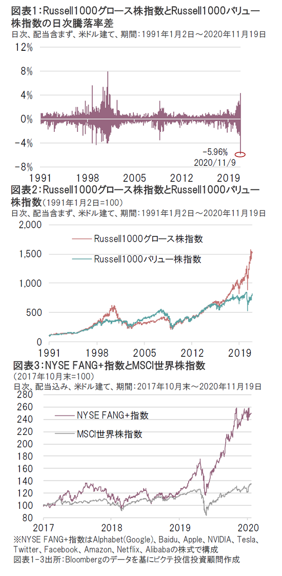 Russell1000グロース株指数とRussell1000バリュー株指数の日次騰落率差の平均は0.01%、標準偏差は0.62%になる(期間は1990年1月2日~2020年11月19日)。つまり、これらの指数の日次騰落率差は、平時であればほとんど無視できるほど小さいことを意味するわけだが、11月9日の騰落率差はー5.96%と極端な騰落率差となった(図表1)。これを標準偏差に換算すると9.6σのイベントになる。