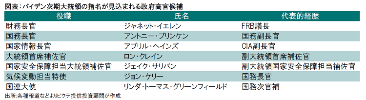 バイデン次期大統領は、11月24日、外交・安全保障関連の政府高官候補について、国務長官にアントリー・ブリケン元国務副長官、国家情報長官にアブリル・ヘインズ元CIA副長官、国家安全保障担当補佐官にジェイク・サリバン元副大統領国家安全保障担当補佐官などの名簿を発表した(図表)。いずれも関連する職務の経験者であり、バイデン氏と共に仕事をしたことのある専門家だ。派手な人事ではないが、大統領を支えるには堅実な人選と言えるのではないか。