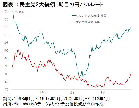過去30年間において、米国の大統領が民主党であった期間は16年だ。このビル・クリントン、バラク・オバマ両大統領に共通しているのは、米国経済の危機的状況の下で政権を発足させた点だろう。クリントン大統領は、資産バブル後の「雇用なき回復」期、そしてオバマ大統領は、リーマンショックから4ヶ月後に就任した。経済の立て直しを迫られるなか、いずれも政権1期目の最初の2~3年間、為替市場はドル安・円高局面だったことも同様だ(図表1)。