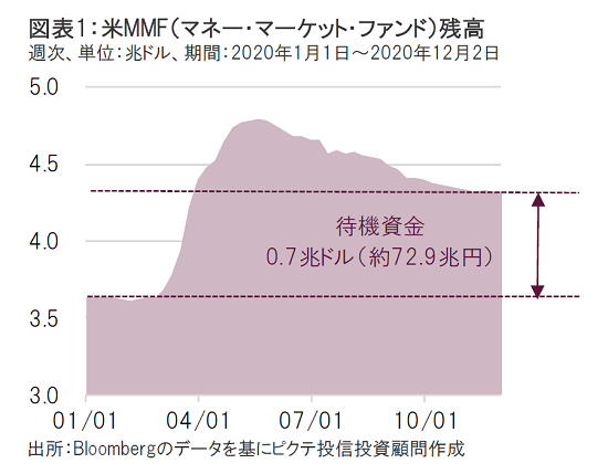 いまの相場環境は、短期であれば景気の弱気材料(景気下振れリスクの高まり→追加景気対策への期待)、中長期であれば景気の強気材料(ワクチン供給→経済正常化)が好感されやすい「いいとこどり相場」となっている。このような状況をもたらしたのは、おそらく積み上がった待機資金(≒キャッシュ)の存在だろう。その待機資金の状況を把握するうえでひとつ参考になるのが米MMF(マネー・マーケット・ファンド)の残高だ。