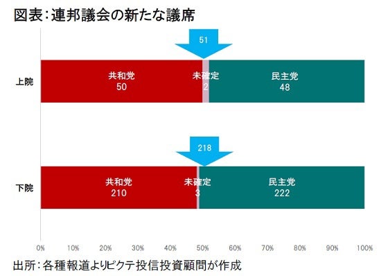 一方、共和党が1議席でも獲ると、同党が過半数に達し、バイデン次期大統領、民主党は共和党議員の少なくとも1名から賛成を得なければ法案を通すことができない。バイデン氏の公約の実現は難しくなり、企業や高額所得者に対する大規模増税などは見送られ可能性が高まるだろう。
