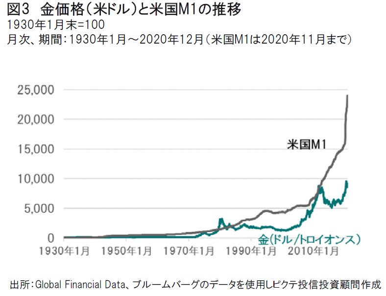 長期的な金価格の変動は金の産出量と通貨の供給量の差異からもたらされている。金の産出量は年率2-3%程度の伸び率であるが、通貨供給量がはるかにそれを上回ってきたことで金価格が上昇(通貨価値が下落)してきた(図3参照)。