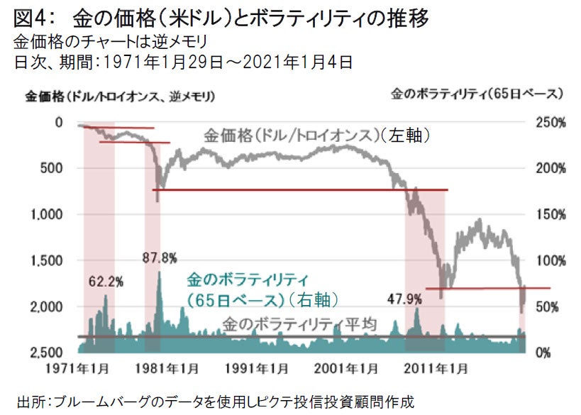金のボラティリティはまだそれほど上昇していない。過去においても史上最高値を更新し短期的な揺り戻しを起こしている間はボラティリティの上昇は限られていた。ボラティリティの上昇は、金価格が上昇波動に移ってからである。