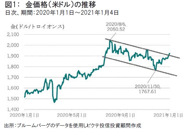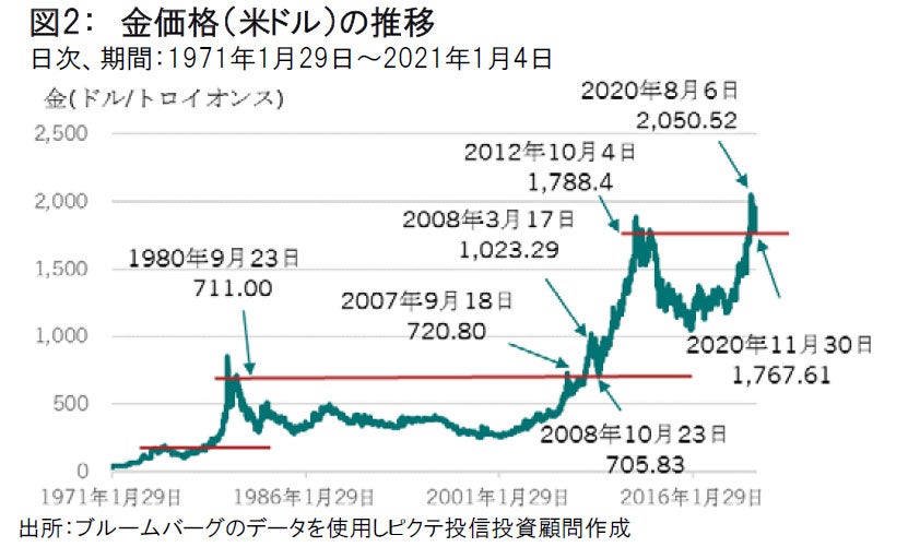 ここでは金が次の大きな上昇波動を形成する前に前回の最高値近辺から一時的に反落することをリバーサル(トレンドの逆転換)と表現しているが、金価格(米ドル、日次ベース)は8月6日の2,050.52ドルをピークに調整局面を迎え、2020年末まではまだ下落トレンドのレンジ内にあった。新年初日となる本日(2021年1月4日)の金価格は1,930ドル台まで上昇、8月以降の下落トレンドのレンジを上抜けてきている(図1参照)。このことは今回の史上最高値更新後のリバーサル(ターゲットは1,788.40近辺と考えていた)が11月30日の1,767.61ドルを底に終了し、次の上昇波動に転換してきている可能性を示唆している。また他のさまざまなテクニカル指標も上昇転換を示し始めている。
