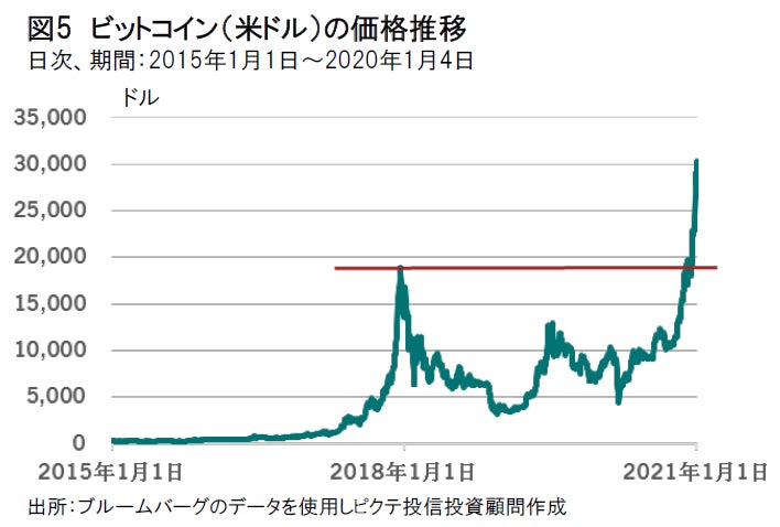 一方、ビットコインは金市場が調整している期間にボラティリティの上昇を伴って急騰、2017年12月の史上最高値を2020年11月に更新し、今年に入って30,000ドルを超えた。ここにきて米国NASDAQ市場とビットコイン市場の相関が高まってきているので分散投資先としては注意が必要であり、この市場のボラティリティは非常に高く(年率で50-110%程度)、市場規模も急速に拡大しているとはいえ60兆円程度である。1,000兆円を超える金市場と投資対象として単純に比較することは出来ない。しかし、ビットコインの価格急騰は金が急騰する前の前兆、つまりは各国の通貨価値が金に対して暴落する前兆と理解するべきと考えている。ビットコインの上昇要因も金と同じく供給量が限られていることに注目すべきだ。