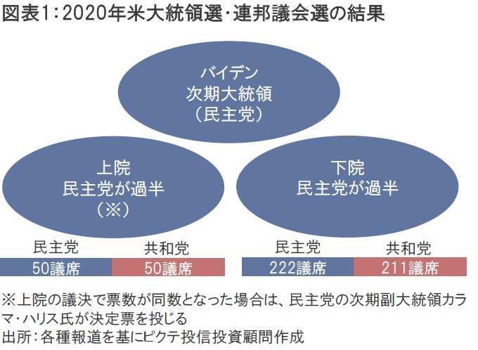 1月5日の米ジョージア州における上院決戦投票の結果、米民主党が大統領選と上下両院を制する「ブルーウェーブ(青い波)」となった。この結果、バイデン次期米大統領が掲げる積極的な財政政策が連邦議会で成立しやすくなるとの見方から、株式市場は上昇基調が続いている。しかし、民主党の法案が全て成立するわけではないので注意が必要だ。