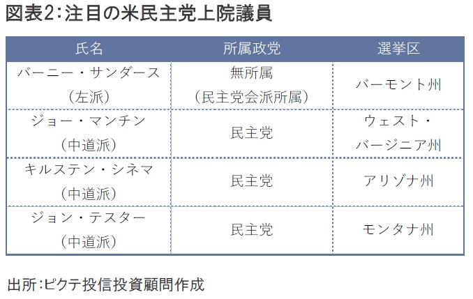 ここでカギを握るのが、民主党内における中道派のジョー・マンチン上院議員とキルステン・シネマ上院議員、ジョン・テスター上院議員の動向だ。「財政調整措置」においてあまりにも左派的な法案になってしまうと、中道派の民主党議員らが廃案に持ち込む可能性があるからだ。特にマンチン氏は石炭産地であるウェスト・バージニア州の上院議員であるため、気候変動対策を含めた法案については反対の立場を取りやすい。「財政調整措置」の発動には、民主党内における融和が不可欠になる。