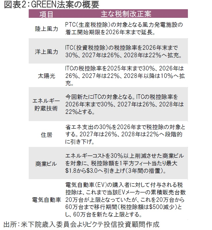今月5日に米下院歳入委員会の民主党議員によって提出されたGREEN法案は、クリーン・エネルギー投資を促進させる「税額控除期間の延長・拡充」と「税額控除対象の拡大」が目玉となっている。