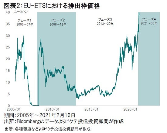 炭素の国境調整が注目される理由は、2つあるのではないか。1つ目は、EUの温室効果ガス排出枠取引市場(EUETS)における排出枠価格の高騰だ(図表2)。EUは2021年に始まったフェーズ4の排出量について、当初の1990年比40%削減から、55%削減へ大幅に目標を引き上げた。排出量削減のコストは上昇せざるを得ないだろう。