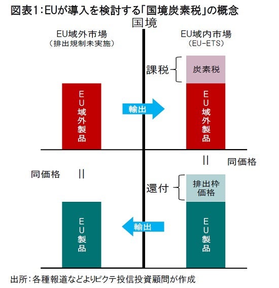 この国境調整は、EU加盟国が排出規制を実施していない国から何かの製品を輸入する場合、EU域内で生産された製品が負担している排出枠購入コストを炭素税として課す制度に他ならない(図表1)。一方、EU域内製品を排出規制未実施の国へ輸出する際は、生産コストに含まれる排出枠の価格を還付する。EUは早期の導入を目指し、今年6月までに制度の具体案を提示する方針だ。