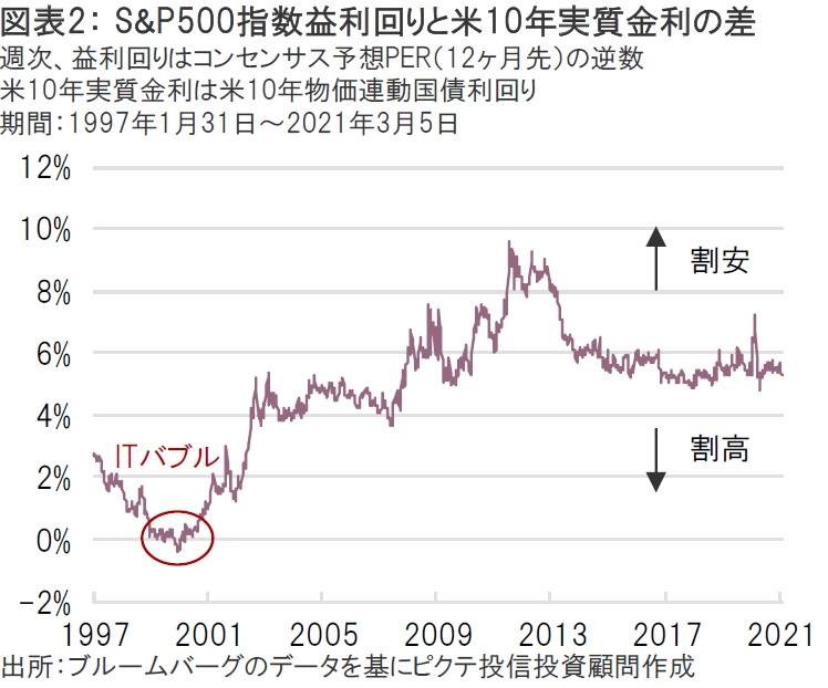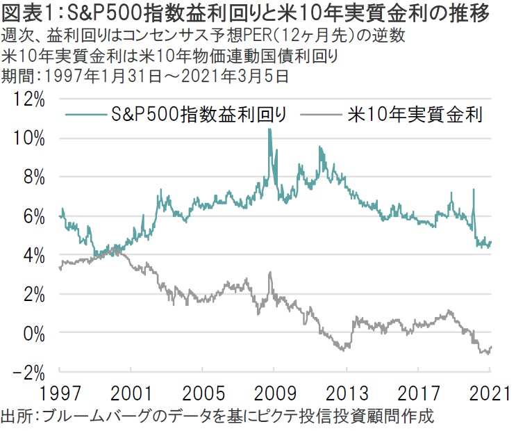 株式市場においても、経済見通しが上方修正されていることを踏まえれば、実質金利の上昇は(本来であれば)歓迎されてしかるべき事象である。しかし、足元では実質金利の上昇が、バリュエーションの低下要因として株安を誘引している。たしかに、コロナ禍においては実質金利の低下とともに益利回りも低下(PERは上昇)してきたため、絶対水準で捉えれば実質金利の上昇は益利回りの上昇(PERの低下)をもたらしそうだ(図表1)。だが、実質金利と益利回りの相対水準で比較すると、景色は大きく異なって見える。