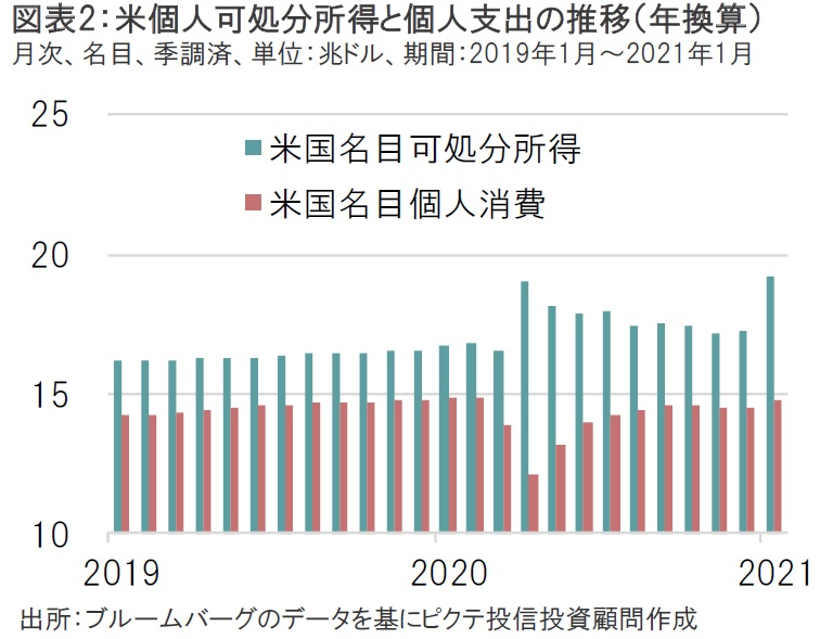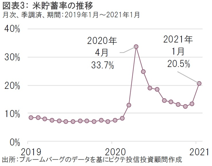 個人の名目可処分所得は直接給付金等で増加した一方、名目個人支出は抑制された状態であるため、足元の貯蓄率はコロナ前の水準と比較して大幅に上昇している。2021年1月時点で20.5%もある貯蓄率は、今回成立した「米国救済計画法」の直接給付金第3弾によって、再び高水準になることが予想される。