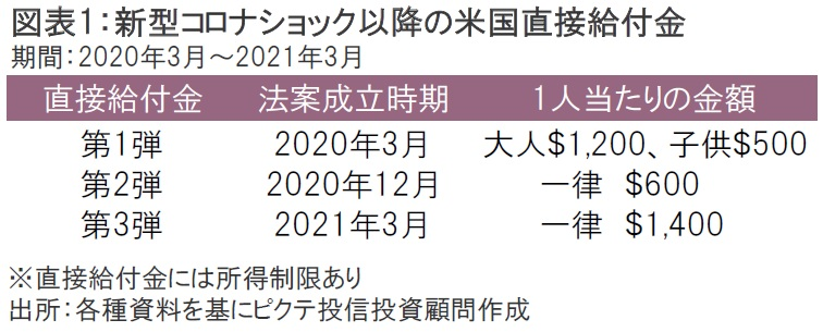 米政府はコロナ禍における個人向けの支援金として、これまで2度にわたって直接給付金を付与してきた。1回目は2020年3月に成立したコロナウイルス支援・救済・経済安全保障(CARES)法で支給された大人1人当たり最大$1,200、17歳未満の子供1人当たり$500の直接給付金だった。2回目は2020年12月に成立した追加景気対策で支給されたもので、一律$600だった。そして今回3回目となる直接給付金は一律で最大$1,400になり、これまでの直接給付金の中では過去最大の金額になる(図表1)。