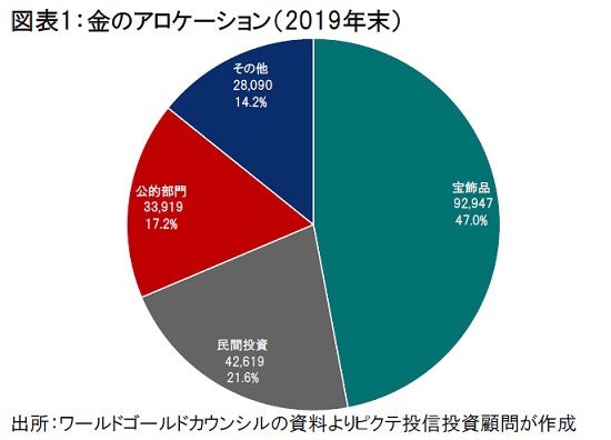 しかしながら、ワールドゴールドカウンシルによれば、2019年末現在、地上に存在する金19万2,947トンのうち、17.2%に当たる3万3,919トンが各国中央銀行など公的部門に保有されてきた(図表1)。世界で最も金を多く持っているのはFRBであり、その量は8,134トン、時価4,555億ドルに達する。兌換を停止したとは言え、金は依然として世界の政策当局にとり通貨の安定を維持するための重要な手段なのだろう。