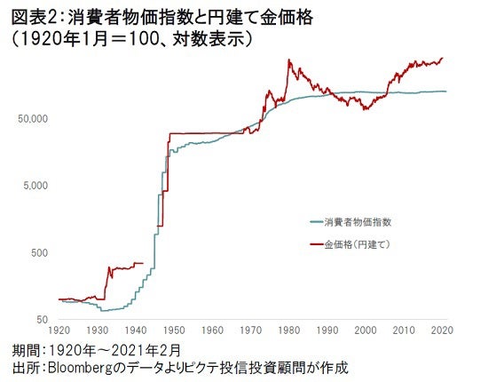 円との関係でも同様のことが言える。過去100年に亘り金は長期的に消費者物価上昇率を超えるパフォーマンスを示してきた(図表2)。特に注目されるのは、終戦直後のハイパーインフレの時代において、金が通貨価値変動のヘッジ手段として機能していたことだろう。また、1970年代の第1次石油危機による「狂乱物価」の下でも、金は実質ベースでの金融資産価値維持に大きく貢献した。