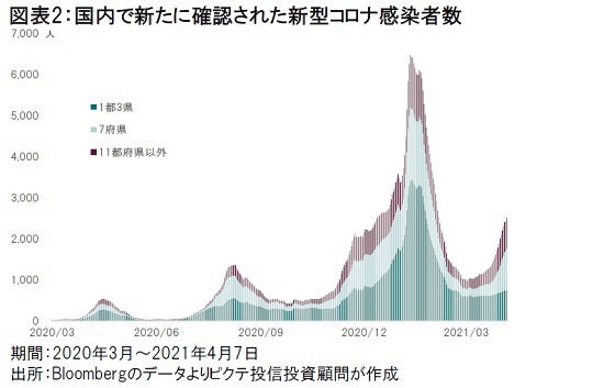 もっとも、早期の解散・総選挙には2つの壁があるだろう。1つは、公明党の意向だ。東京都を重視する同党は、都議選に集中するため、同時期の総選挙を望んでいないと見られる。2つ目の壁は新型コロナである。1府2県に発令されたまん延防止措置は5月5日が期日で、それまでの解散は難しい。また、首都圏、近畿圏だけでなく全国で感染者は増加傾向にあり、5、6月に第4波のピークが来る可能性は否定できない(図表2)。感染拡大期における総選挙は、政権与党にとって不利になることが予想される。