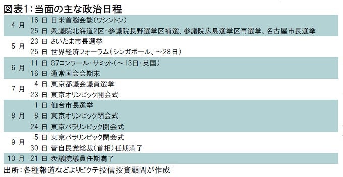 衆議院の任期を考えれば、総選挙のタイミングは5月下旬、7月4日、そして10月に絞られるだろう。5月下旬より前だと公示がゴールデンウィーク中になり、6月の総選挙なら事務的な観点から都議選との同日選が効率的だからだ。その後は五輪が開幕するため、解散は早くてもパラリンピック閉会直後となり、総選挙は10月に行われることになる(図表1)。