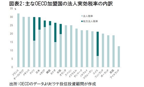 また、「最低税率」の定義も課題だ。フランスの実効税率は全て国税だが、スイスの実効税率21.15%のうち、国税は6.70%に過ぎず、地方税分が14.45%に達する(図表2)。対象に地方税を含めるのか否かにより、各国の国内調整がさらに難しくなる可能性は否定できない。さらに、研究開発への優遇税制など、制度の統一には多くの調整が必要だ。