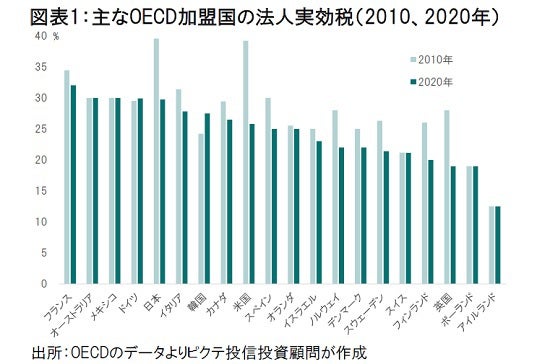 リーマンショック以降、自国企業の優位性を高め、企業誘致を強化するため、主要国の多くが法人税率の引き下げを行ってきた。過去10年間で見ると、OECD加盟35ヶ国のなかで、法人税減税に最も積極的だったのは米国に他ならない。州税などを合わせた法定実効税率は、2010年の39.21%から、2020年には25.77%へと13.44ポイント引き下げられている(図表1)。特にドナルド・トランプ前大統領の時代に大幅な減税が行われた。