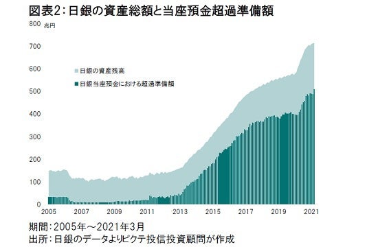 そうしたなか、昨年度の日銀のバランスシートを見ると、資産総額は109兆7,452億円増加した(図表2)。長期国債の保有残高が22兆2,357億円増に留まる一方、共通担保資金供給が71兆5,116億円増えている。新型コロナ禍の下、民間金融機関への資金供給を強化した結果だろう。