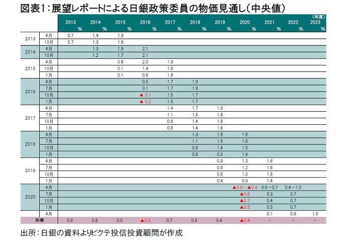 今回の展望レポートによれば、政策委員による生鮮食品を除く消費者物価上昇率の見通し(中央値)は、2021年度0.1%、2022年度0.8%、2023年度1.0%とされた(図表1)。黒田総裁の任期満了は2023年4月8日である。つまり、2013年4月4日に量的・質的緩和を採用して以降、日銀は歴史的な金融緩和を採用してきたものの、10年を経ても「2%の安定的な物価目標」達成は見通せないようだ。