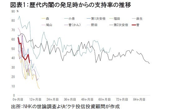小渕恵三内閣以降ののべ10人の首相の内閣支持率をNHKの世論調査で追うと、政権発足から8ヶ月目の平均は37.3%だった(図表1)。菅内閣の5月の支持率は35%なので、平均から大きく乖離しているわけではない。