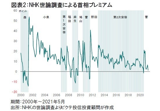 NHKによる5月の世論調査では、菅首相の首相プレミアムは1.3ポイントに過ぎなかった(図表2)。つまり、自民党の支持層以外、菅内閣を支持する有権者は極めて少ないわけだ。