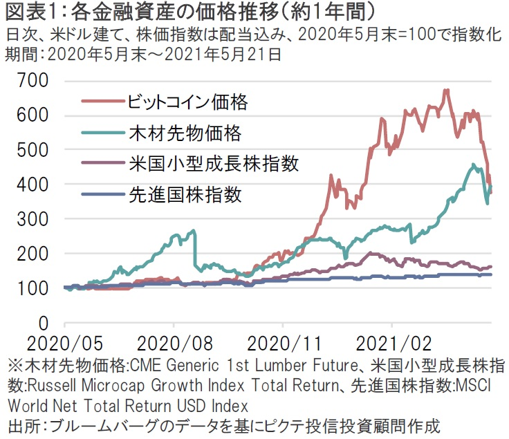 5月21日現在、暗号資産のビットコインは今月の高値(5/8)から安値(5/21)まで40%急落したほか、暗号資産とは全く関係の無い木材先物価格も今月の高値(5/7)から安値(5/18)まで24%急落した。金融市場ではFRBのテーパリング観測等を背景とした「リターン・リバーサル」の動きが広がっており、期待先行で上昇していた米国小型成長株指数も連れ安の展開となった。