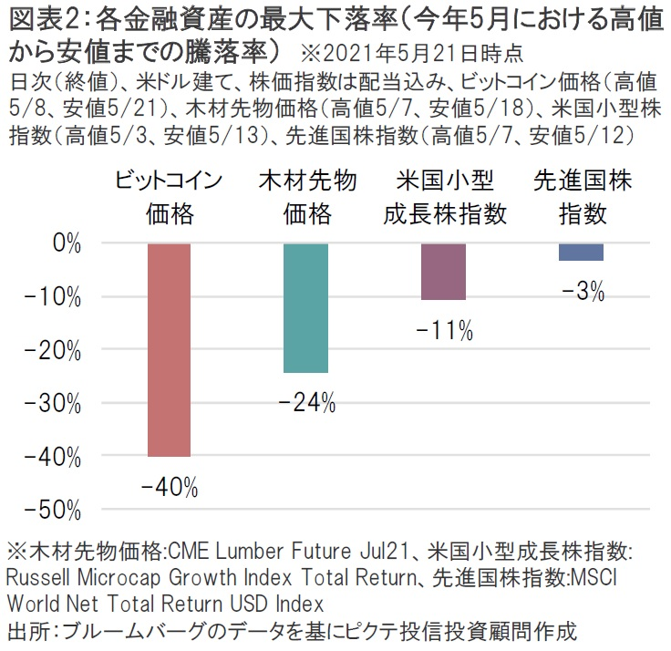 もちろん急落した金融資産にはそれぞれ固有の要因がある。例えば、暗号資産(仮想通貨)のビットコインであれば、電気自動車大手テスラの創業者であるイーロン・マスク氏が、(今年3月にビットコインでテスラ車を購入可能と発表したにもかかわらず)ビットコインでのテスラ車購入の受付停止を発表したことや、中国当局が暗号資産の規制強化に動いたことなどが挙げられる。